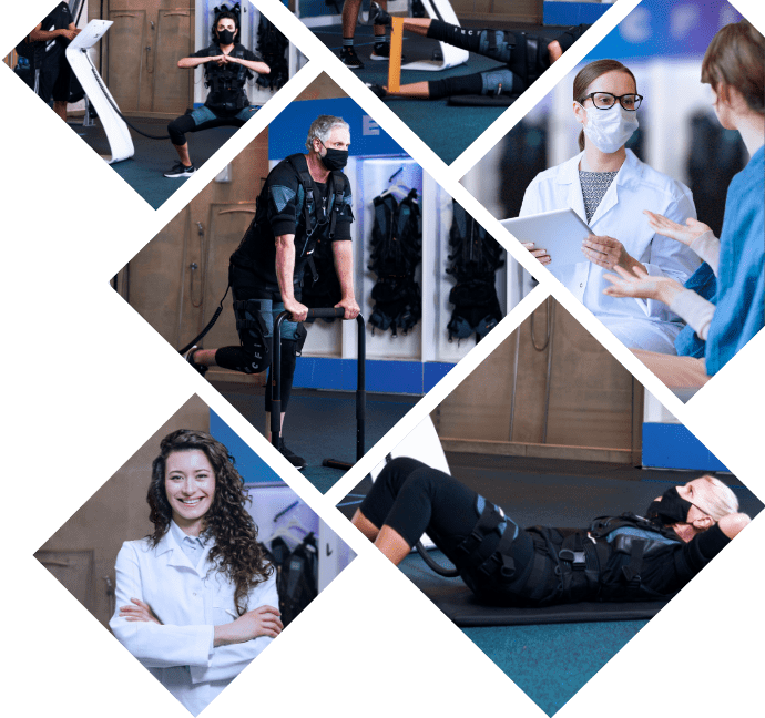 Treinos de eletroestimulação muscular combinados com exercícios cardiorrespiratórios, exercícios de mobilidade, flexibilidade e liberação miofascial.